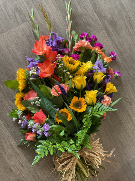 Our Seasonal Tied Spray is a natural and heartfelt tribute, created with the very best flowers of the moment. Handcrafted by our skilled florists, each spray is designed in a loose, elegant style using fresh, seasonal blooms and complementary foliage.