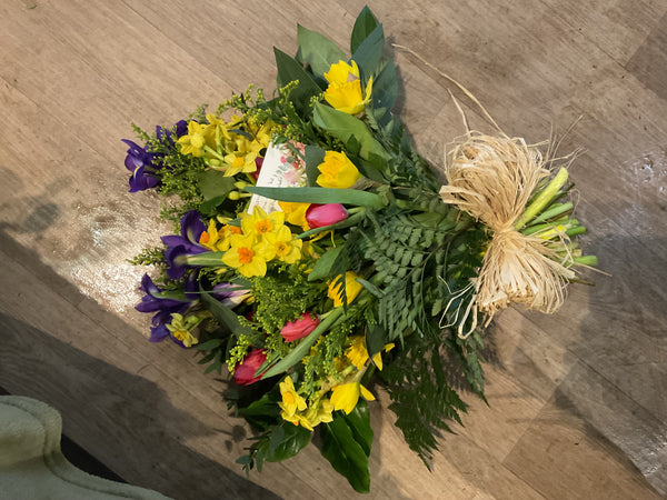 A selection of flowers created in a tied spray using flowers chosen by the florist!